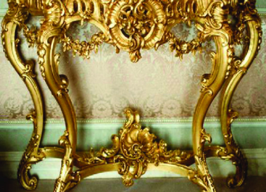 Toàn bộ vai ghế và chân ghế bằng đồng được phủ lên một lớp vàng sáng bóng và nổi bât. Các họa tiết của chân bàn được phủ một lớp vàng 24k làm cho chiếc bàn và ghế thành một thể thống nhất.